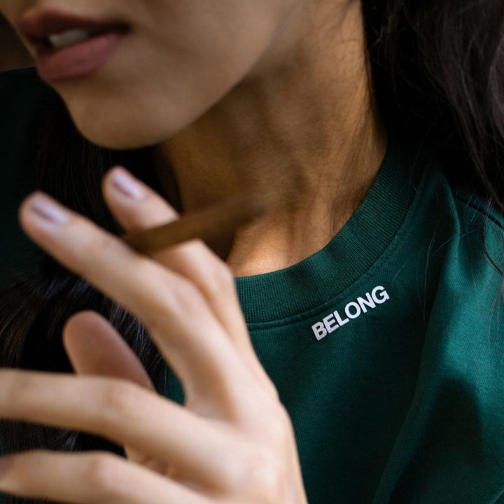 Side View: The right sleeve contains a delicate stitching of the brand's mantra: "If you belong, don't be long."